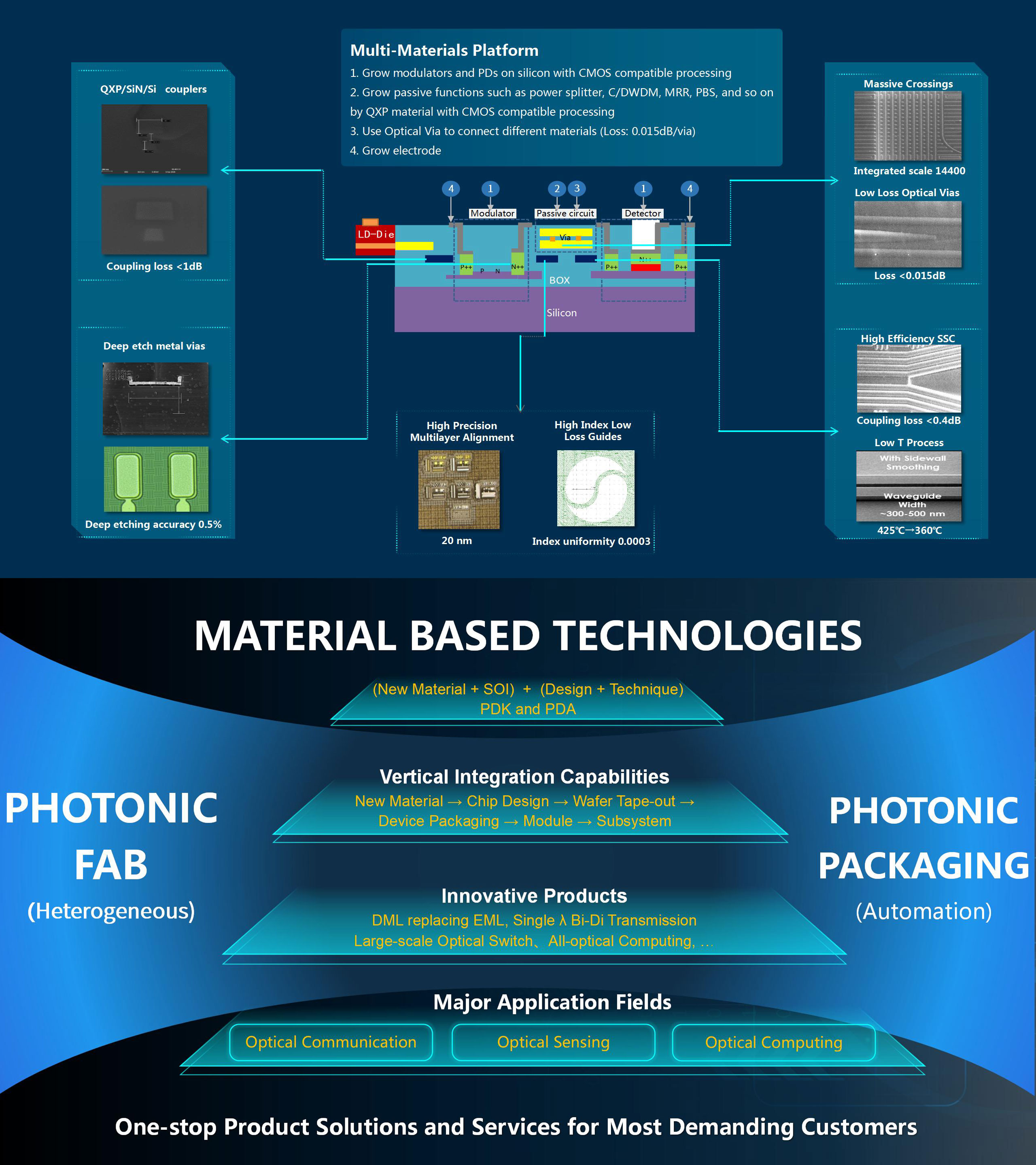 QXP has established a unique 3D integrated passive dielectric waveguide technology system, featuring high refractive index difference and low loss. It is also compatible with silicon-based CMOS technology, creating the fourth waveguide technology system, which is the key foundation to realizing large-scale heterogeneous material mixed 3D integration.